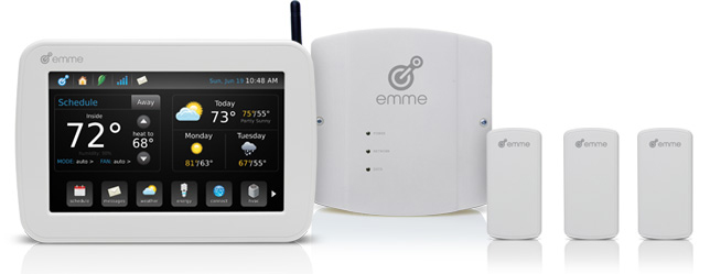 emme room-by-room zone control uses your (1) existing heating and cooling equipment and (2) ductwork. When the emme system is installed in your home, a wireless (3) Smart Controllerâ„¢ is placed in each room. It periodically measures and transmits the room’s temperature. A (4) wireless receiver collects this information and passes it along to the (5) master unit. Using temperature information from each room as well as temperature data from an (6) outside monitor, sophisticated software determines which rooms need conditioning. Using air pressure and vacuum supplied from an external (7) air pump and power supply individual rooms are included or removed from the conditioning cycle by opening and closing (8) dampers located in the ducts. The master unit then activates the heating, cooling, and circulation equipment in your home to achieve your settings. Using information from the (9) HVAC sensor, the master unit can determine how many dampers can be simultaneously closed without affecting your equipment. You can adjust the temperature for single rooms, groups of rooms, or the entire home using the touch-screen on the (10) main display. Once set up, the emme system automatically maintains your temperature settings throughout your house.
